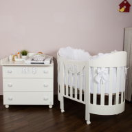 Овальная кроватка смотрится очень стильно и необычно, а если дополнить ее балдахином, то Вы создадите поистине сказочное место для вашего малыша.
